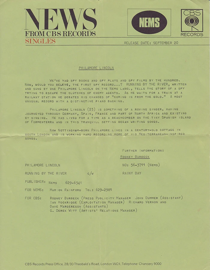 For those wanting more the only real option is to track down his rare single, ‘Running By the River’ which is something I’ve been attempting to do for some time but I recently hit the jackpot scoring not only the single but the accompanying press release.