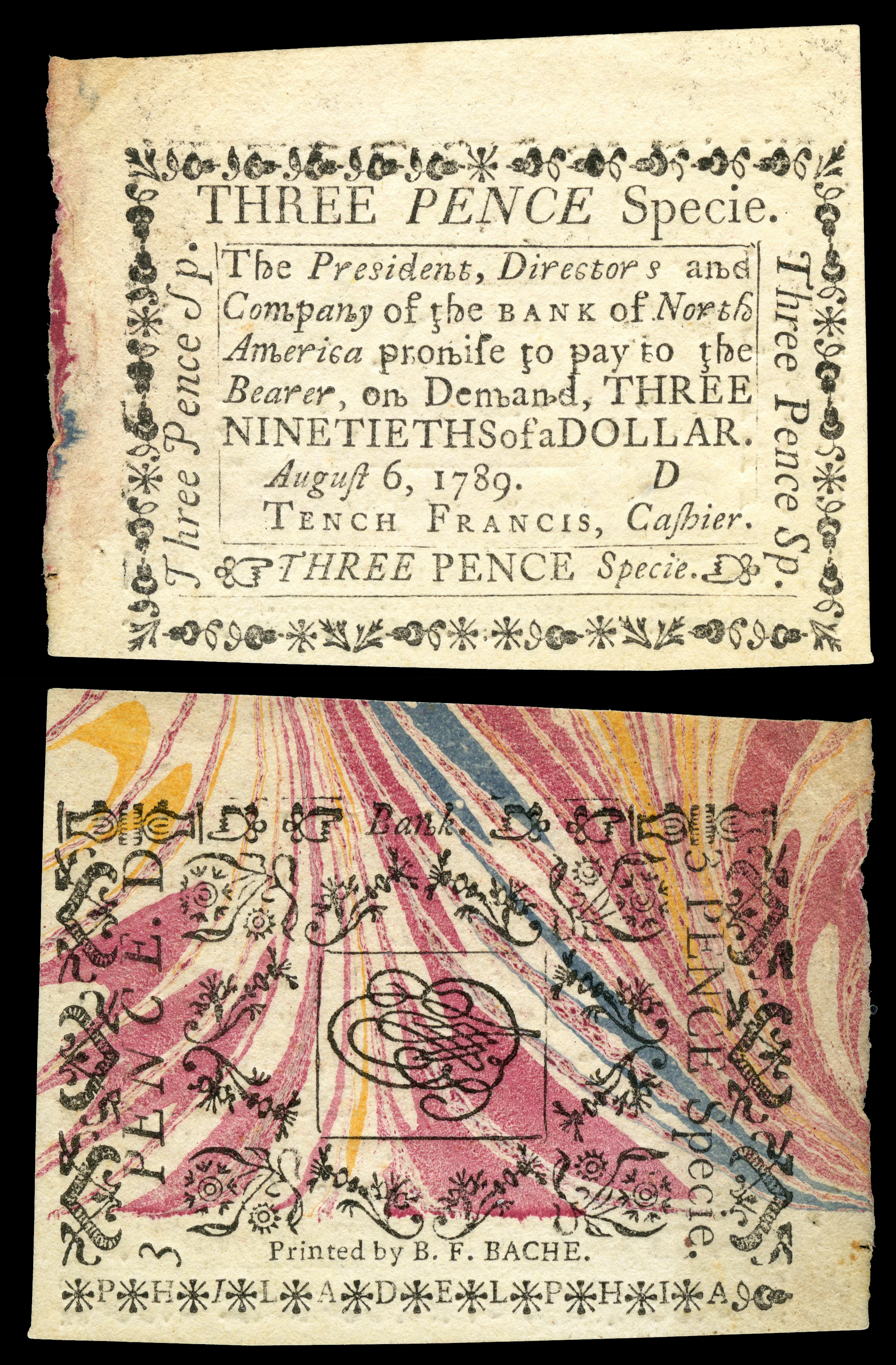 Three pence as issued by the Bank of North America (the nation’s first central bank) 1789. The note was printed by Benjamin Franklin Bache (Benjamin Franklin’s grandson) on marbled paper obtained by Benjamin Franklin.
