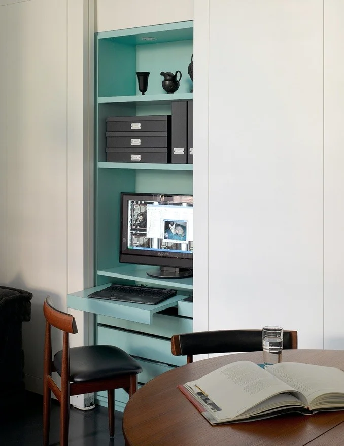 We're moving soon so I'm spending even more time than usual browsing interior design sites. This small London flat is a corker. I really like how they've painted the inside of this tiny office in a Tiffany's Box blue. Openstudio Architects do good work. Wish we could hire them.